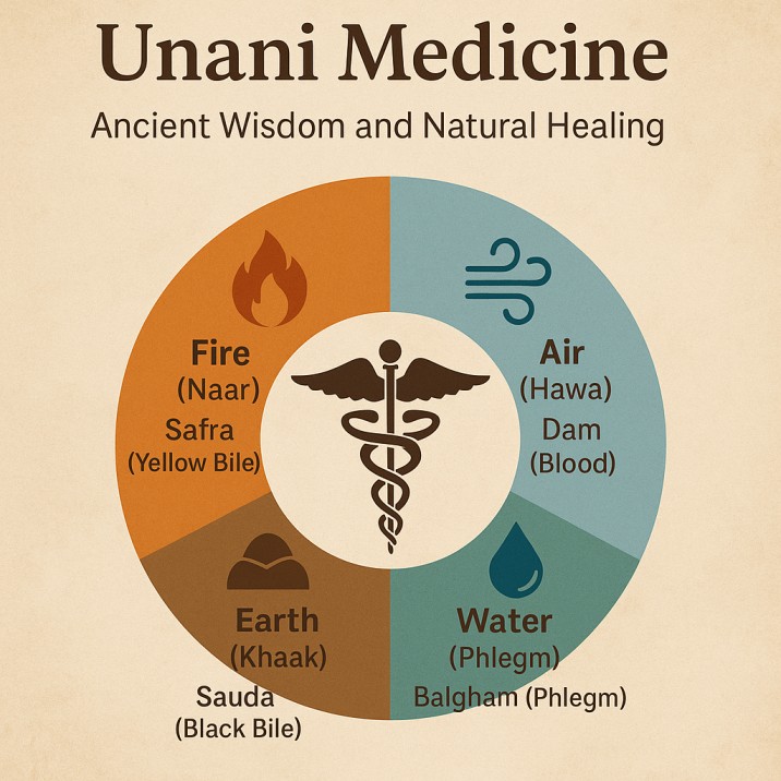 Unani healing revolves around maintaining balance between four body humors (Akhlat), influenced by natural elements (Anasir), individual temperament (Mizaj), and external factors like food, climate, and lifestyle.